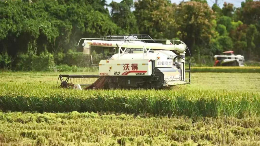今天,江苏海安市马儿桥家庭农场的800余亩稻田里,金黄稻浪随风翻滚,四台收割机在稻田里往来穿梭。