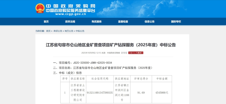 日前,中国政府采购网发布:江苏省句容市仑山地区金矿普查项目矿产钻探服务(2025年度)中标公告。仑山地区金矿普查项目矿产钻探即将启动。